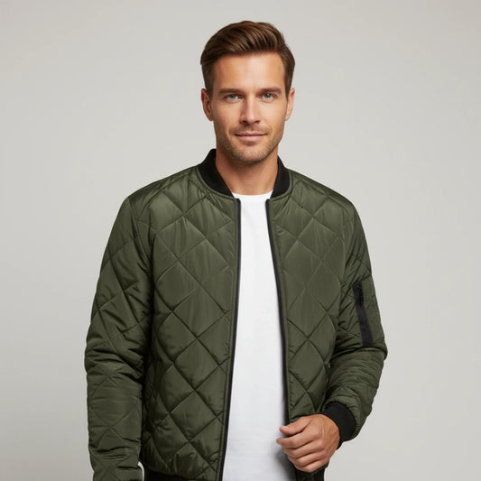 Men's Quilted Bomber Jacket With Diamond Quilting Lightweight Zip Up With Ribbed Trim Black