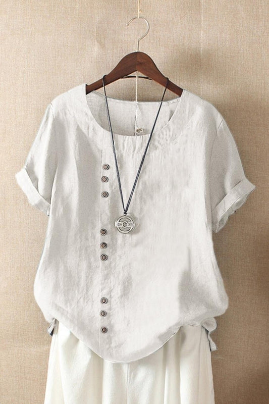 Women's Round Neck Solid Color Buttons Short Sleeves Blouse