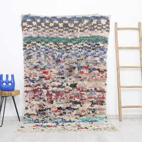 An unparalleled vintage masterpiece, carefully crafted by Berber Tribes in the Boucherouite style using upcycled textiles. Measurements: 4'1" x 7'0" (125 cm x 212 cm),