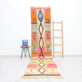 A singular moroccan rug, meticulously woven in the small city of Boujaad in Morocco's Chaouia-Ouardigha region. Size: 2'6" x 13'2" (78 cm x 403 cm).