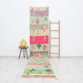 A singular moroccan rug, meticulously woven in the small city of Boujaad in Morocco's Chaouia-Ouardigha region. Size: 2'6" x 13'3" (78 cm x 406 cm).