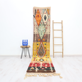 A singular moroccan rug, meticulously woven in the small city of Boujaad in Morocco's Chaouia-Ouardigha region. Size: 2'4" x 11'8" (72 cm x 360 cm).