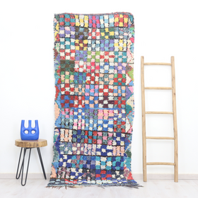 An unparalleled vintage masterpiece, carefully crafted by Berber Tribes in the Boucherouite style using upcycled textiles. Measurements: 3'3" x 7'3" (100 cm x 224 cm),