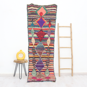 An unparalleled vintage masterpiece, carefully crafted by Berber Tribes in the Boucherouite style using upcycled textiles. Measurements: 2'6" x 8'2" (80 cm x 250 cm),