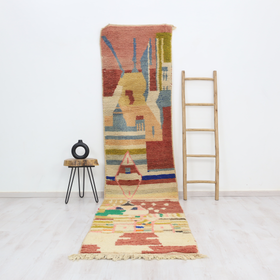 A singular moroccan rug, meticulously woven in the small city of Boujaad in Morocco's Chaouia-Ouardigha region. Size: 2'8" x 12'7" (85 cm x 388 cm).