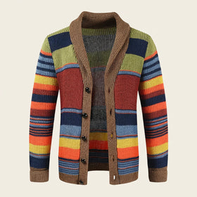 Men's Multicolor Striped Shawl Collar Cardigan Sweater With Button Front And Ribbed Knit Trim