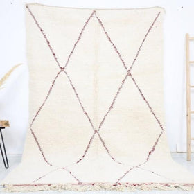 Design and craft meet in a refined, minimalist motif. The soft ivory-cream field is accented by a geometric diamond lattice in a dark, warm tone, giving the rug a calm, versatile presence that complements both muted palettes and bolder interiors. Its classic Beni Ourain silhouette adds a touch of bohemian sophistication while staying perfectly modern.