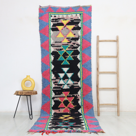 An unparalleled vintage masterpiece, carefully crafted by Berber Tribes in the Boucherouite style using upcycled textiles. Measurements: 3'3" x 10'0" (100 cm x 305 cm),