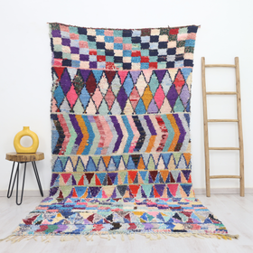 An unparalleled vintage masterpiece, carefully crafted by Berber Tribes in the Boucherouite style using upcycled textiles. Measurements: 5'0" x 9'1" (151 cm x 278 cm),