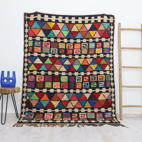An unparalleled vintage masterpiece, carefully crafted by Berber Tribes in the Boucherouite style using upcycled textiles. Measurements: 4'7" x 6'2" (142 cm x 190 cm),